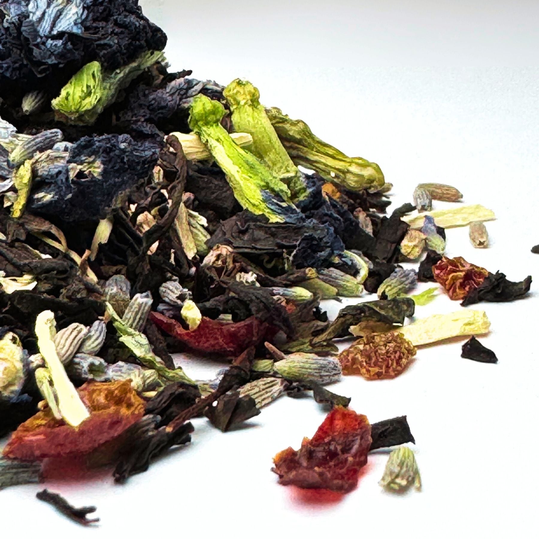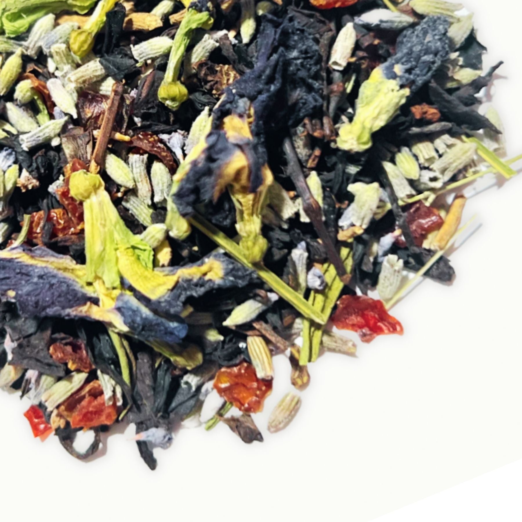 Esta mezcla casera de hierbas cuidadosamente elaborada incluye guisante mariposa vietnamita, grosella negra europea, lavanda francesa, ashwaganda india, valeriana búlgara y escaramujo chileno.