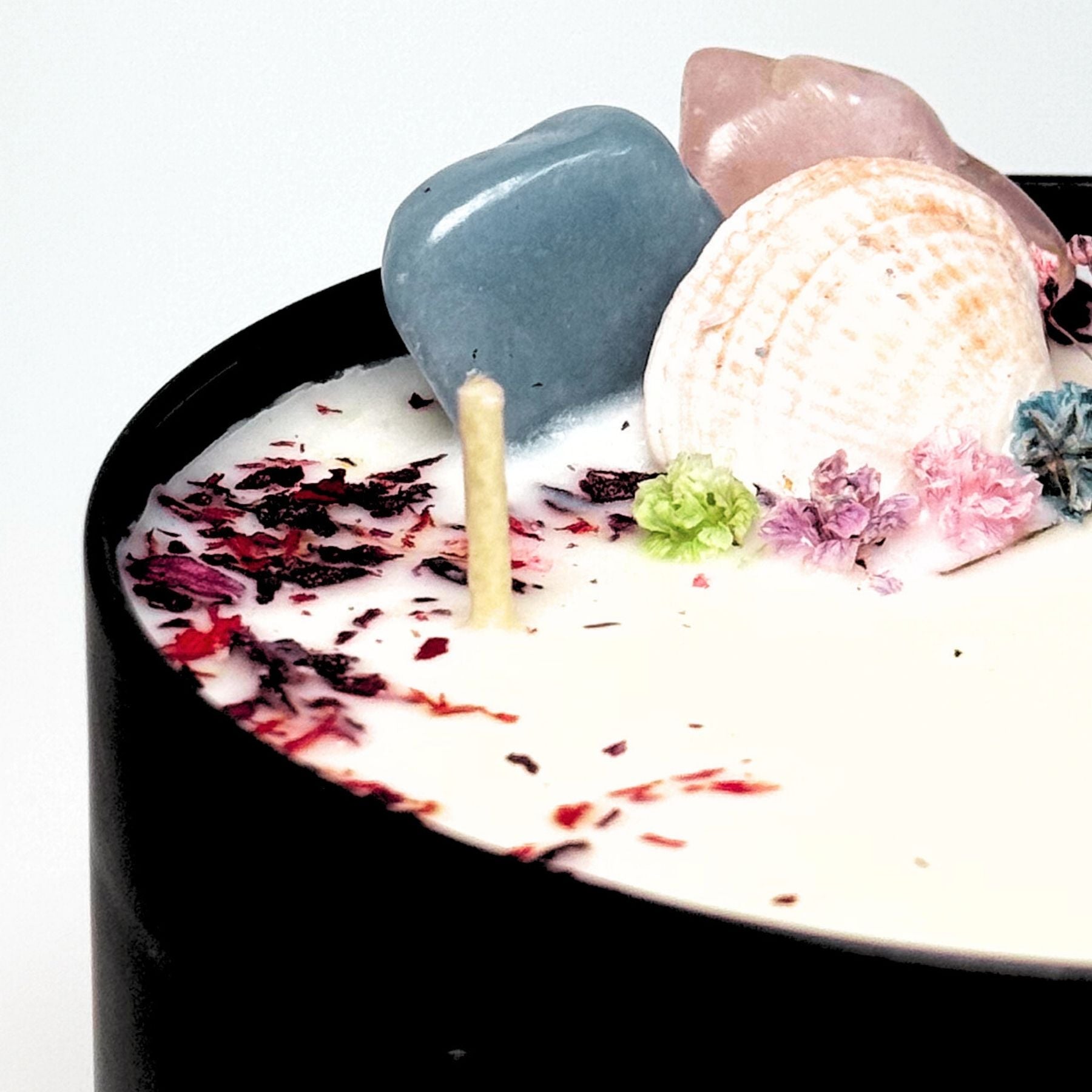 Crafted with intention, this candle is infused with energetically aligned crystals to deepen relaxation and heart-centered presence. Once the candle has burned down, these stones can be cleansed and kept as companions for emotional wellness and inner calm.