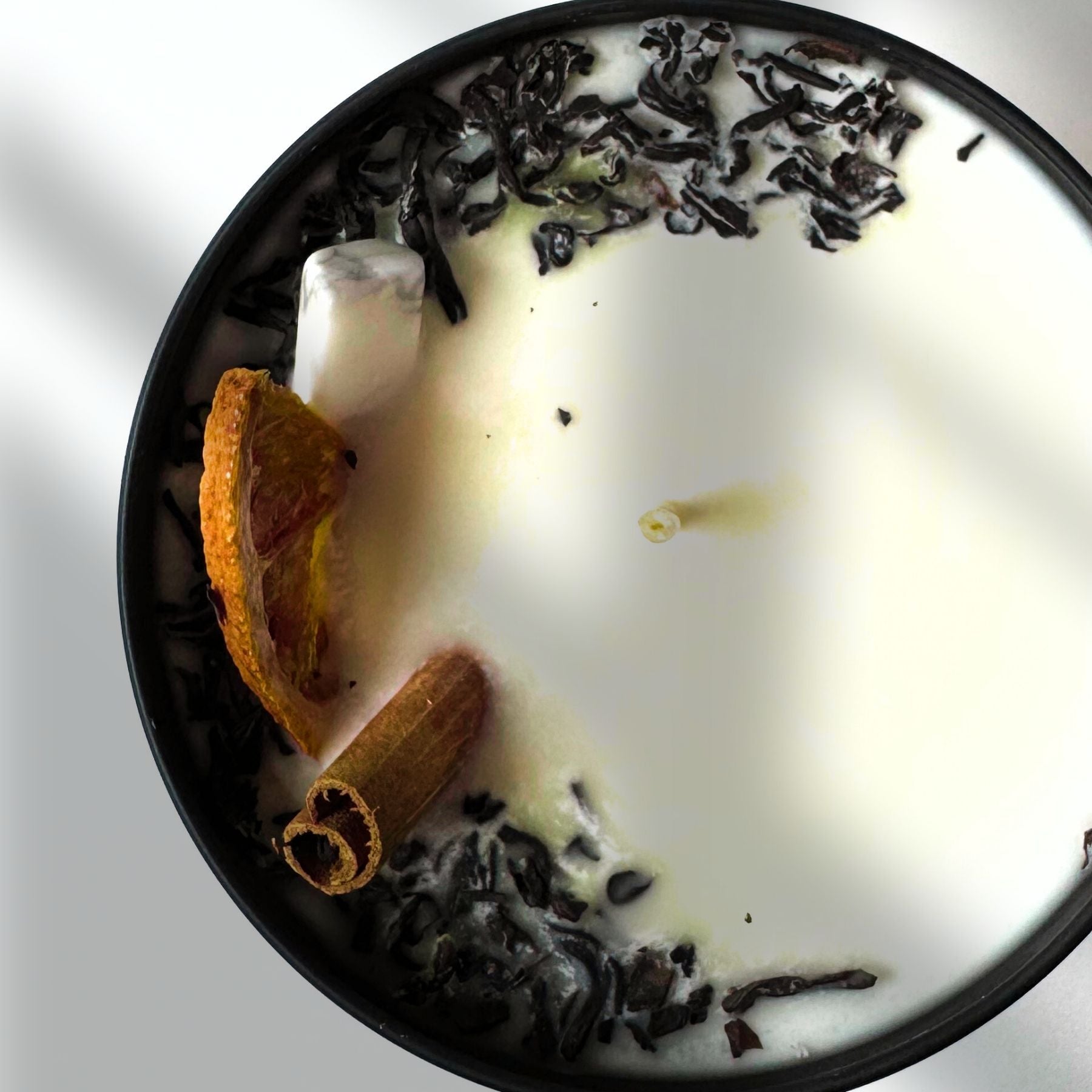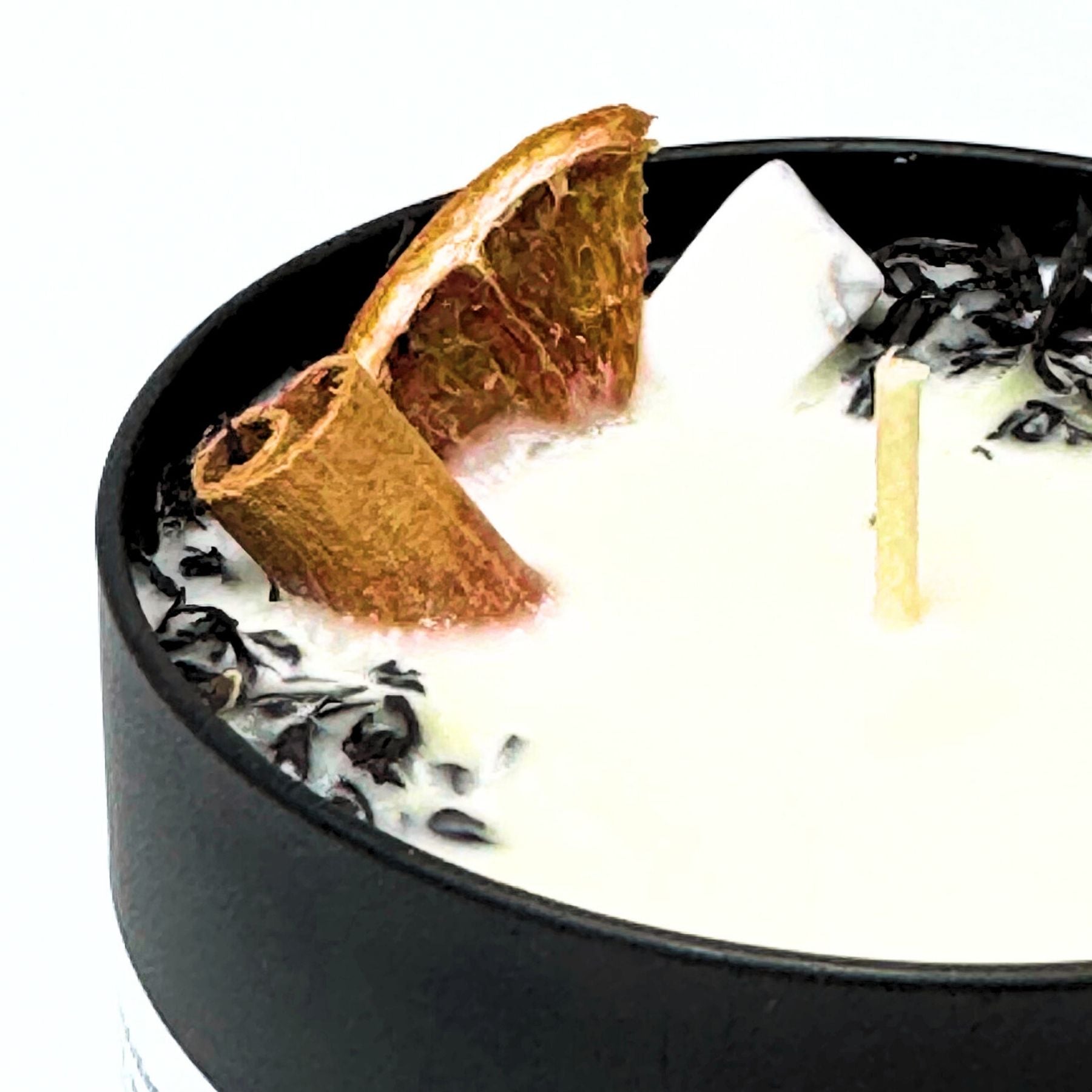 The candle opens with uplifting bergamot and juicy orange, brightening the energy of the space with cheerful vibrancy. As the scent deepens, cinnamon and clove bring cozy warmth and ancient associations with prosperity and protection. Vanilla finishes the blend with a rich, creamy sweetness—comforting and softly magnetic.