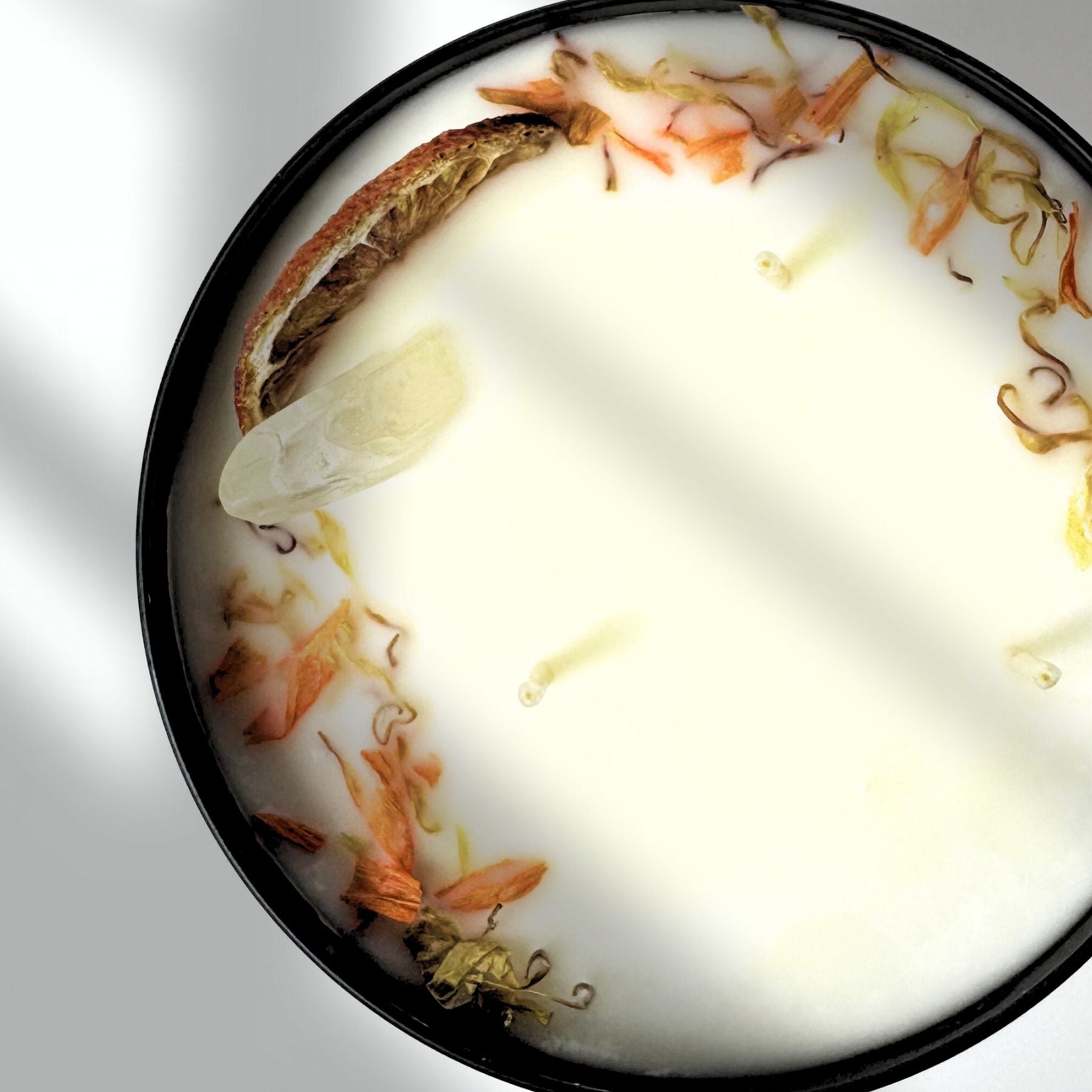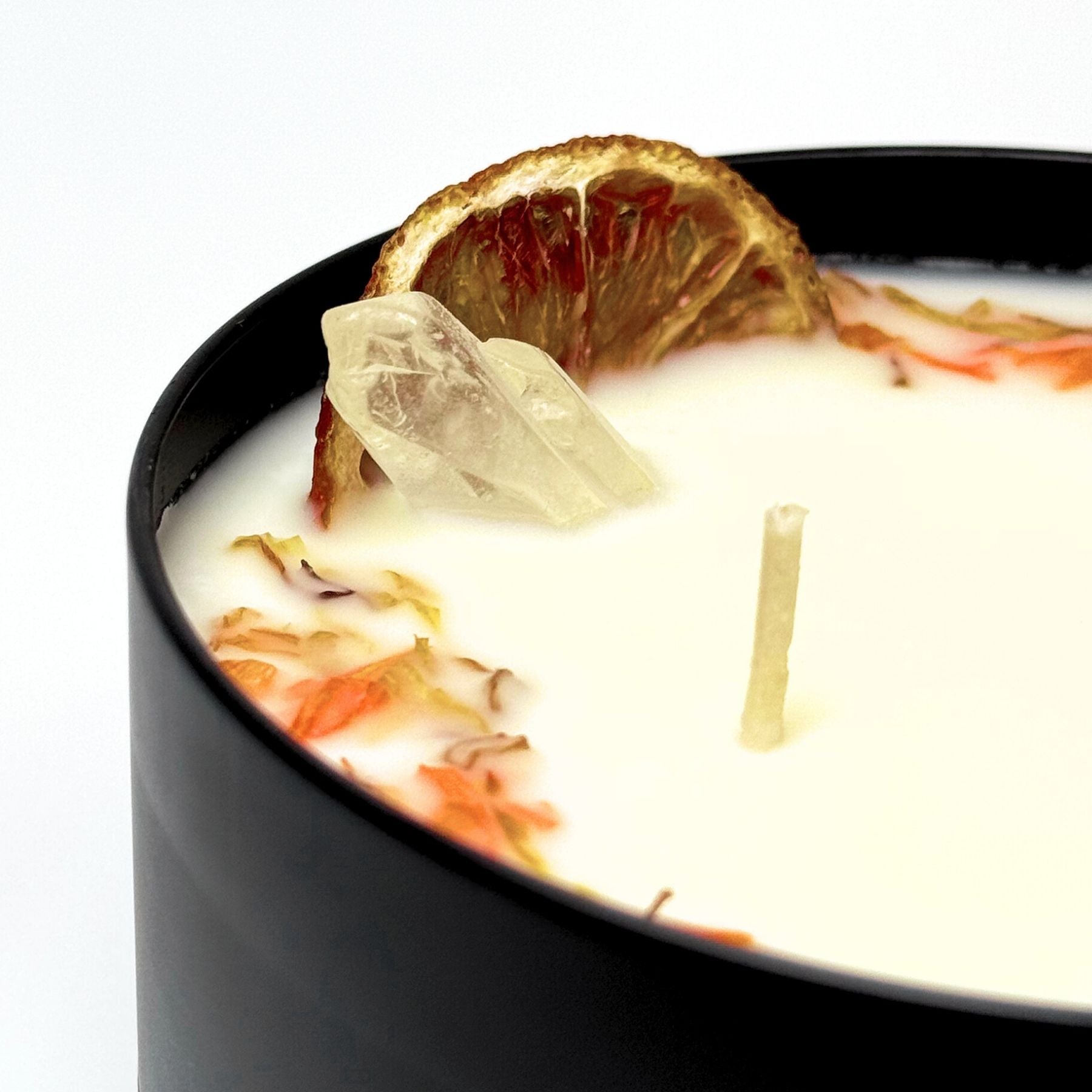 Crafted with intention, this candle is infused with energetically aligned crystals to amplify radiant energy and positivity. Once the candle has burned down, these stones can be cleansed and kept as personal talismans to carry sunshine with you wherever you go.